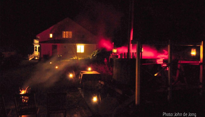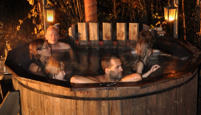 • En myskväll i badtunnan! Fylld med 2000 liter källvatten som värms upp kring 39 grader Celsius. Bada under stjärnhimlen, serveras med ett välsmakande småplock med ekologiska produkter, trädgården runtom är stämningsfull upplyst med fotogenlyktor;