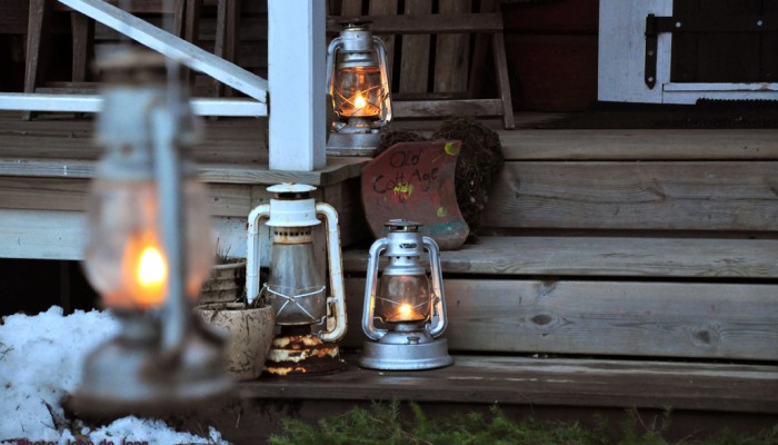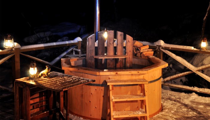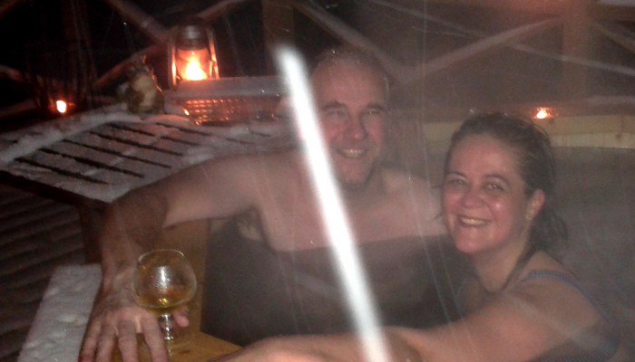 Outside evening bathing in an wooden hottub on the terras lit with oil lamps;