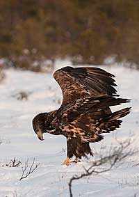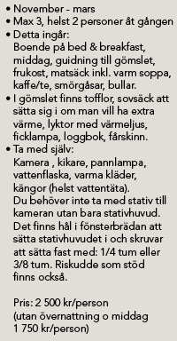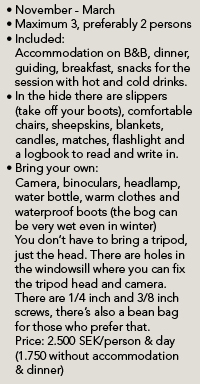 November – mars. Vi guidar dig ut till gömslet. Det är ca 300 meter att gå från vägen. Man anländer före gryningen (ca en timme före soluppgången) och sitter normalt kvar till skymningen för att inte störa fåglarna. För den hängivne och tålmodiga örnfluktaren eller fotografen/ filmaren.