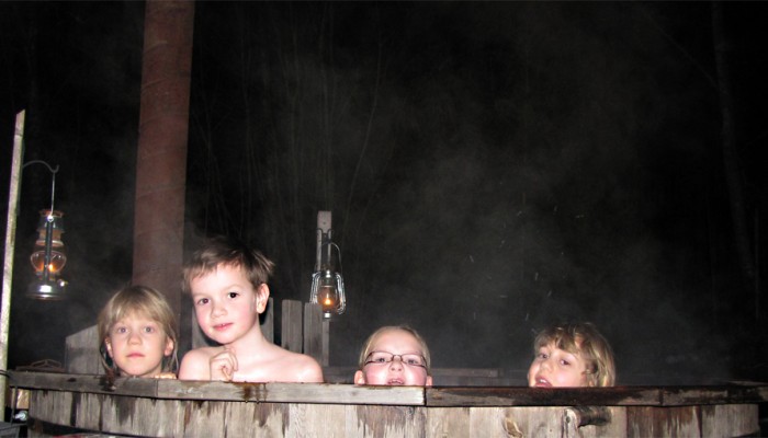 Koppla av i 40 grader varmt vatten i en vedeldad badtunna! Njut av tystnaden, snöflingorna eller titta på en klar stjärnhimmel. Ibland hör man ugglor som ropar från skogen.